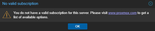 The first thing you will see is a nag message stating that you do not have a valid subscription for your server. This is expected since we are using Proxmox for personal use and don’t have an enterprise subscription. Simply ignore this message and click OK for now, we will disable this nag message in just a moment.